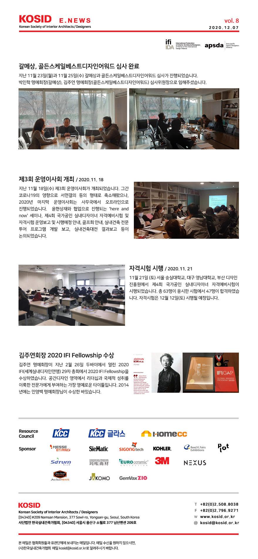 [KOSID E-News] 갈메상, 골든스케일어워드 심사, 제3회 운영이사회 개최, 실내디자이너 자격시험 시행, 김주연 명예회장 2020 IFI Fellowship 수상